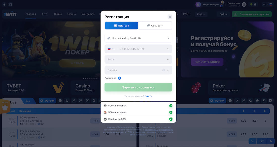 При наличии новый клиент этого букмекера может указать промокод. Для завершения регистрации и начала игры также необходимо принять правила БК и подтвердить достижение совершеннолетнего возраста.